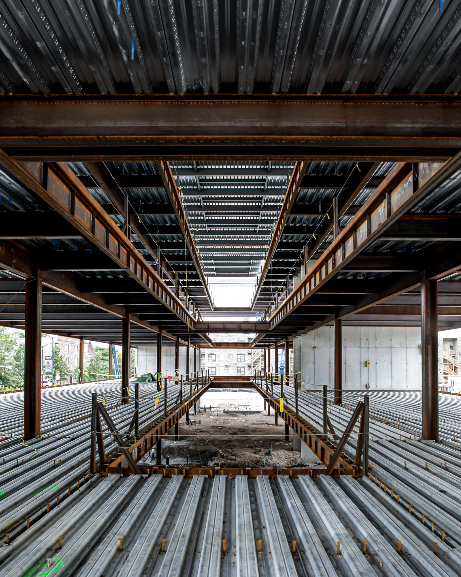 Foundation and first floors completed with structural beams installed.